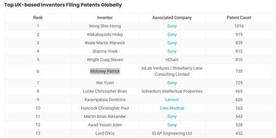 I’m truly delighted to be named the 6th most prolific UK-based inventors filing patents globally (between 01-2020 and 2025). It has been a privilege to work alongside some of the most forward-thinking and innovative companies, that not only value new ideas but also recognise the importance of protecting them through patents.